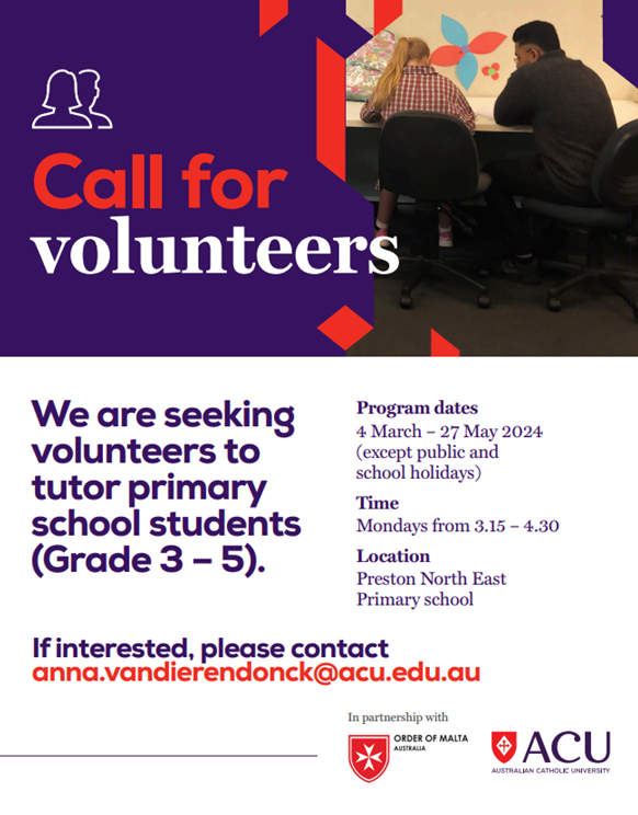 Read to Learn involves members and volunteers of the Order of Malta and students from Australian Catholic University providing one-on-one tutoring during weekly sessions to students identified as requiring additional support to develop their reading and literacy skills.